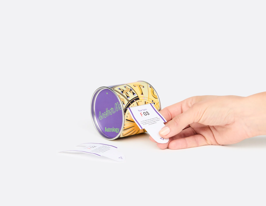 • Lata metálica dourada com cartas de plástico e mão a segurar uma carta