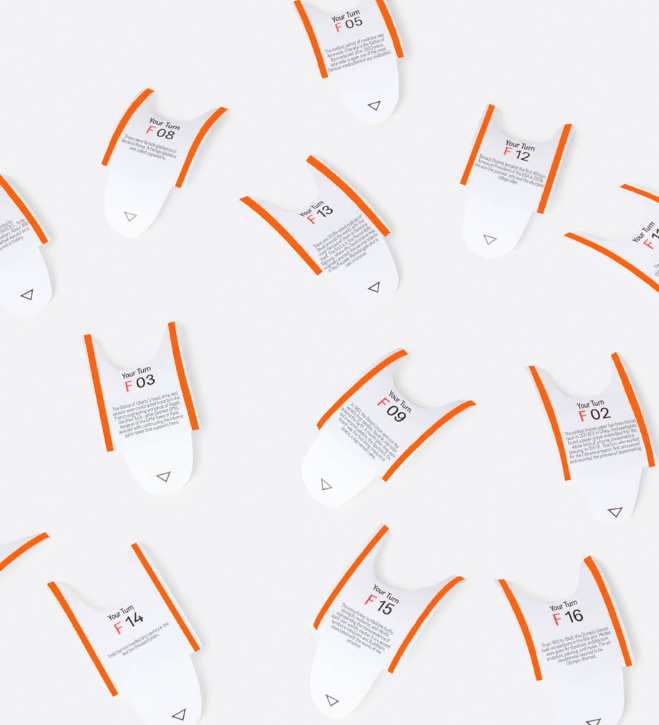 • Pacotes brancos com detalhes laranja e etiquetas com códigos