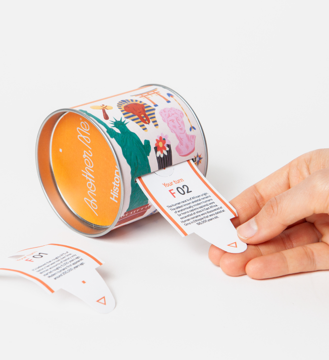 • Embalagem azul clara com rolo de imagens históricas coloridas e texto laranja