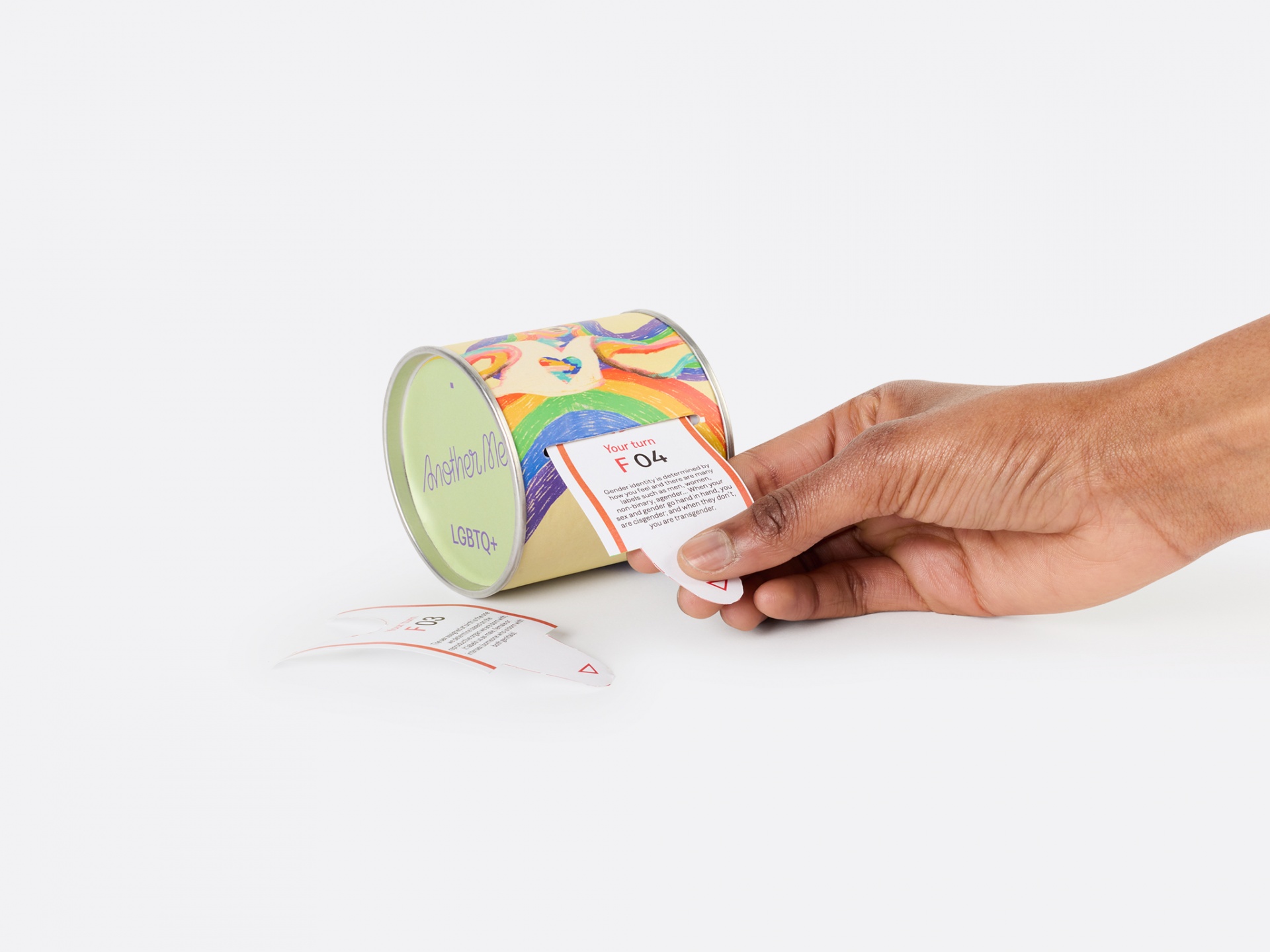 • Lata com etiqueta roxa e texto sobre 100 curiosidades LGBTQ+