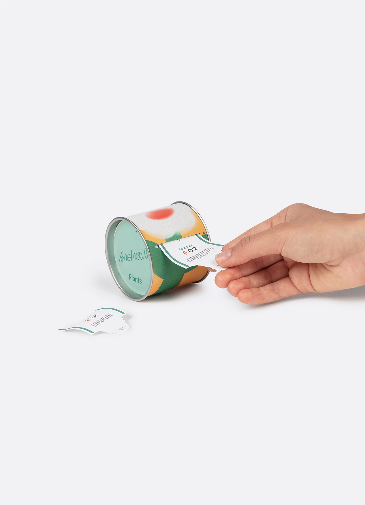 • Lata com plantas e etiqueta a ser retirada por uma mão