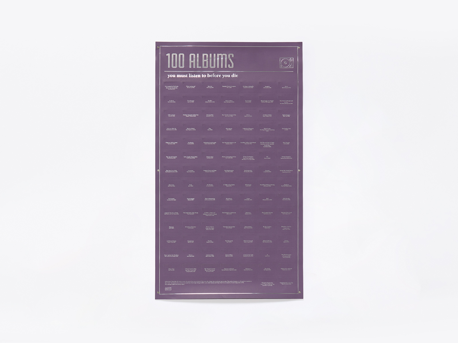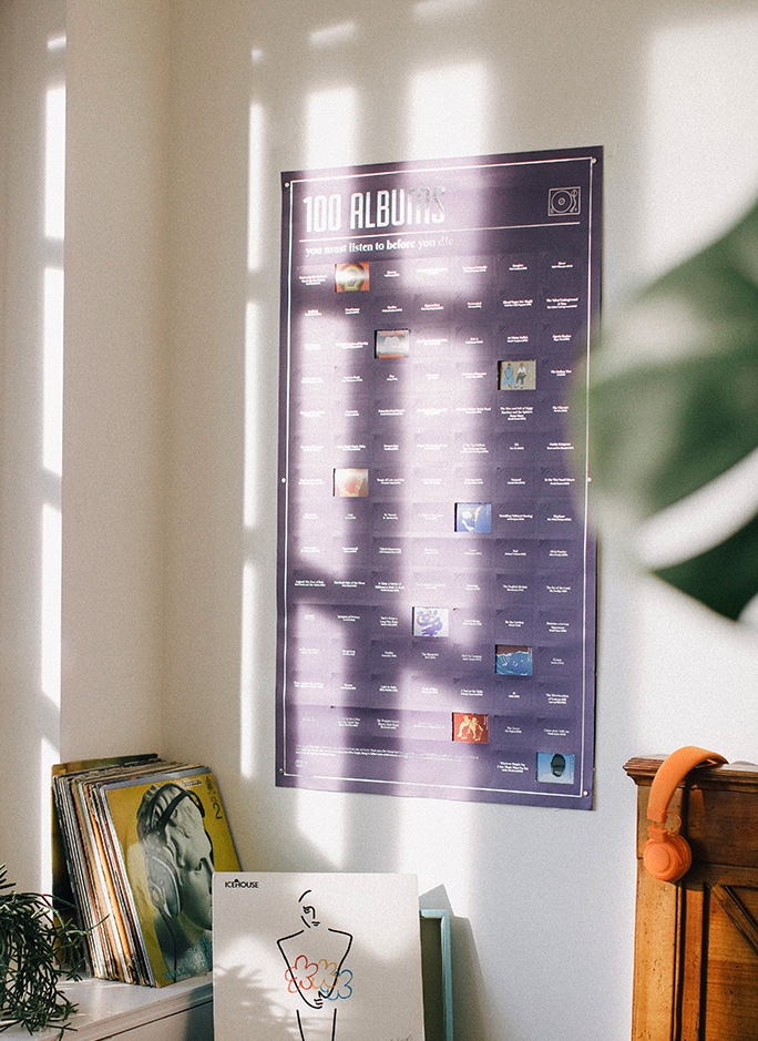 Whether you are a music lover, a playlist addict or simply enjoy discovering new songs and artists, there are some albums that you must listen to in your lifetime. Some are legendary masterpieces that never go out of fashion, others are icons of our time, but all of them are part of our musical culture, one that allows us to connect to our feelings through lyrics and music. This interactive poster is a compilation of all these famous albums. Hang it up, track your progress and keep it forever to remember how good music is for the soul. Turn up the volume and enjoy!