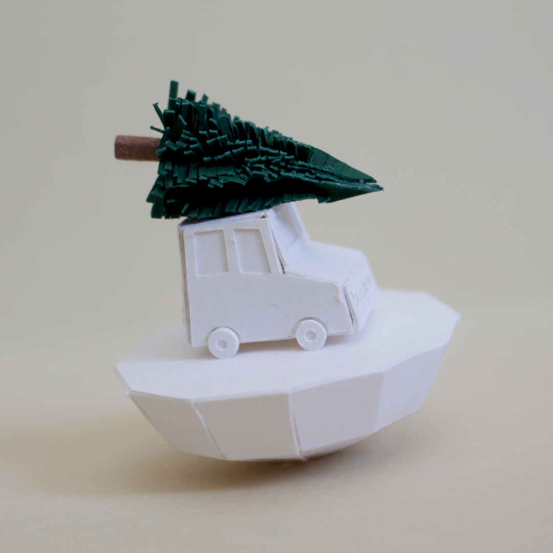 • Miniatura branca de papel de carro a transportar árvore verde sobre base branca