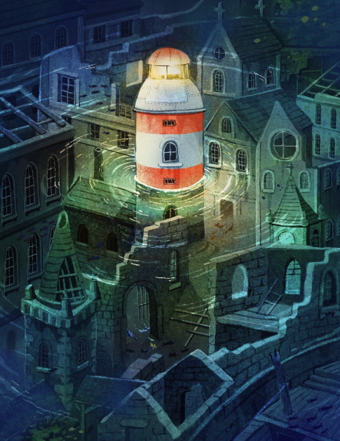 Farol vermelho e branco dentro de ruínas de pedra numa cena noturna