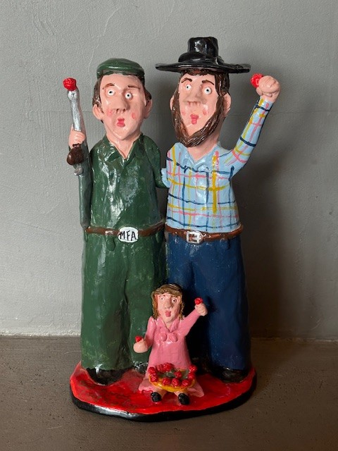 Figuras em cerâmica de dois adultos e uma criança com objetos vermelhos