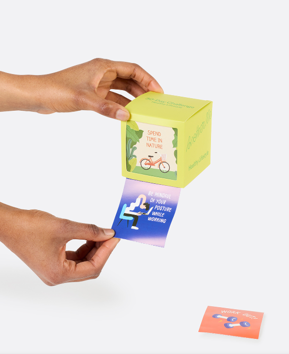 • Mãos seguram cubo com mensagens sobre hábitos saudáveis e cartões coloridos com conselhos.