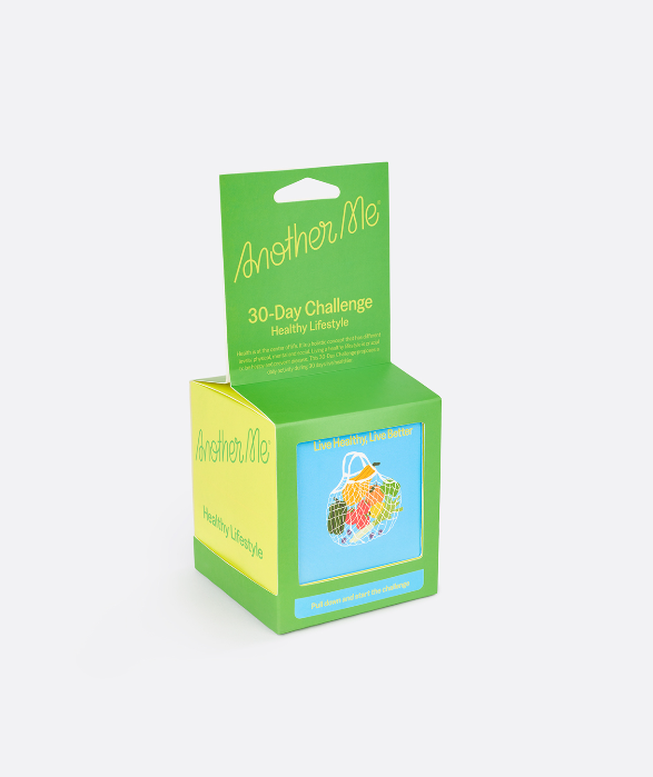• Caixa verde e amarela de 30-Day Challenge AnotherMe com ilustração de saco com frutas e legumes