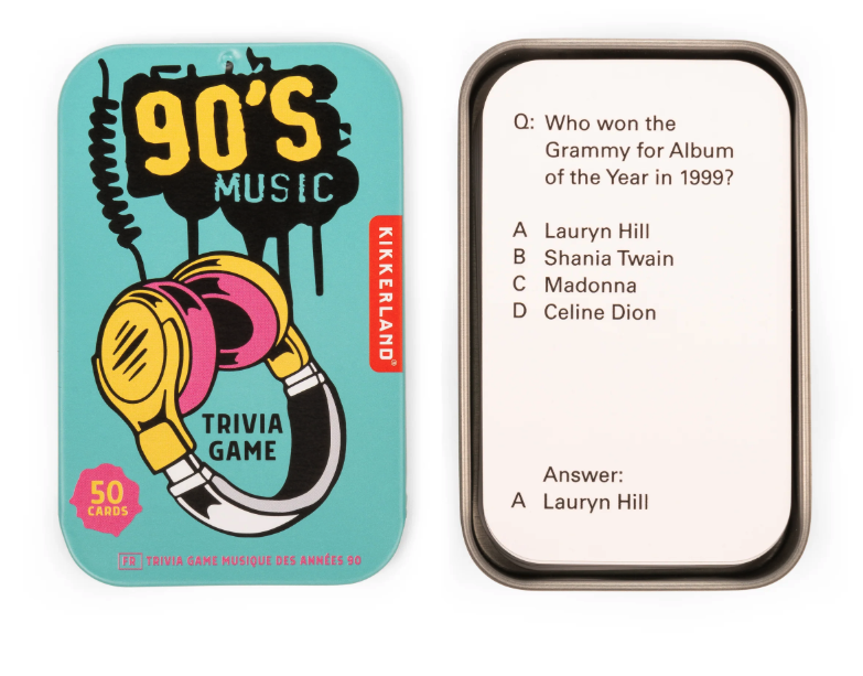 Traga de volta a nostalgia da música dos anos 90 com este conjunto de 50 perguntas triviais, embaladas em uma lata prática para diversão em qualquer lugar!
