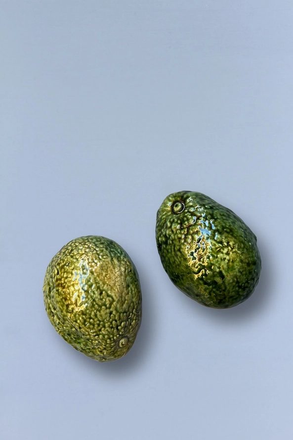 • Dois objetos verdes com textura que se assemelham a abacates sobre fundo cinzento
