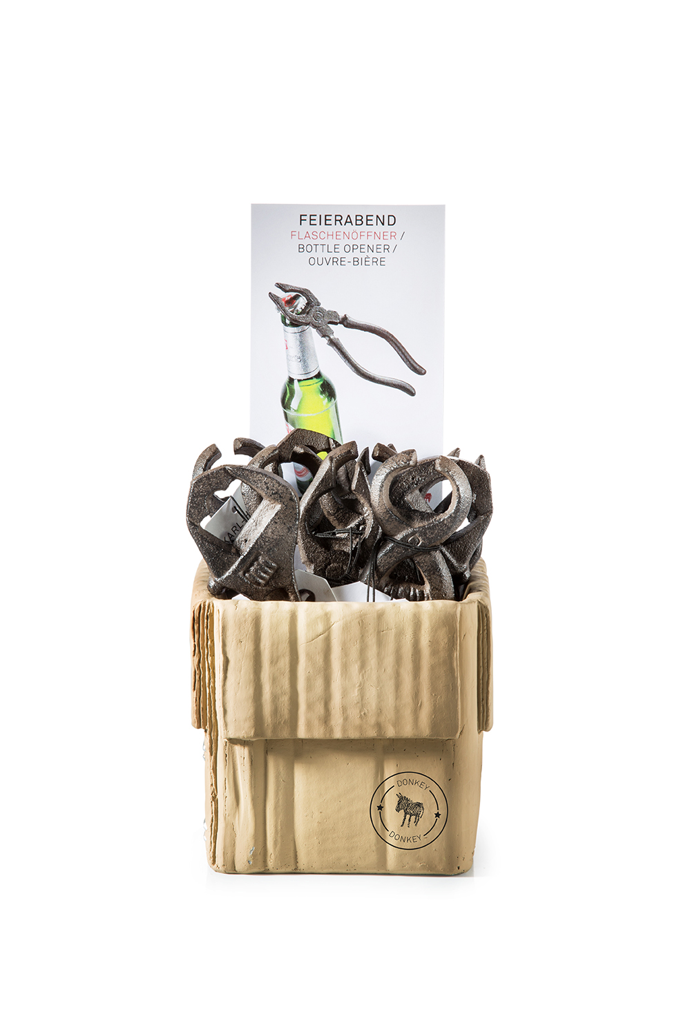 • Abridores de garrafa em ferro fundido formato ferramentas em expositor bege tipo caixa com etiqueta informativa.