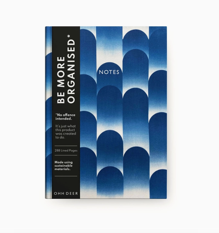 • Caderno azul com padrão em degradé e faixa preta vertical com texto branco e marca OH DEER