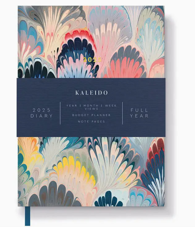 • Capa de agenda 2025 decorada com padrão colorido tipo mármore, faixa azul com texto branco e fita marcador azul.