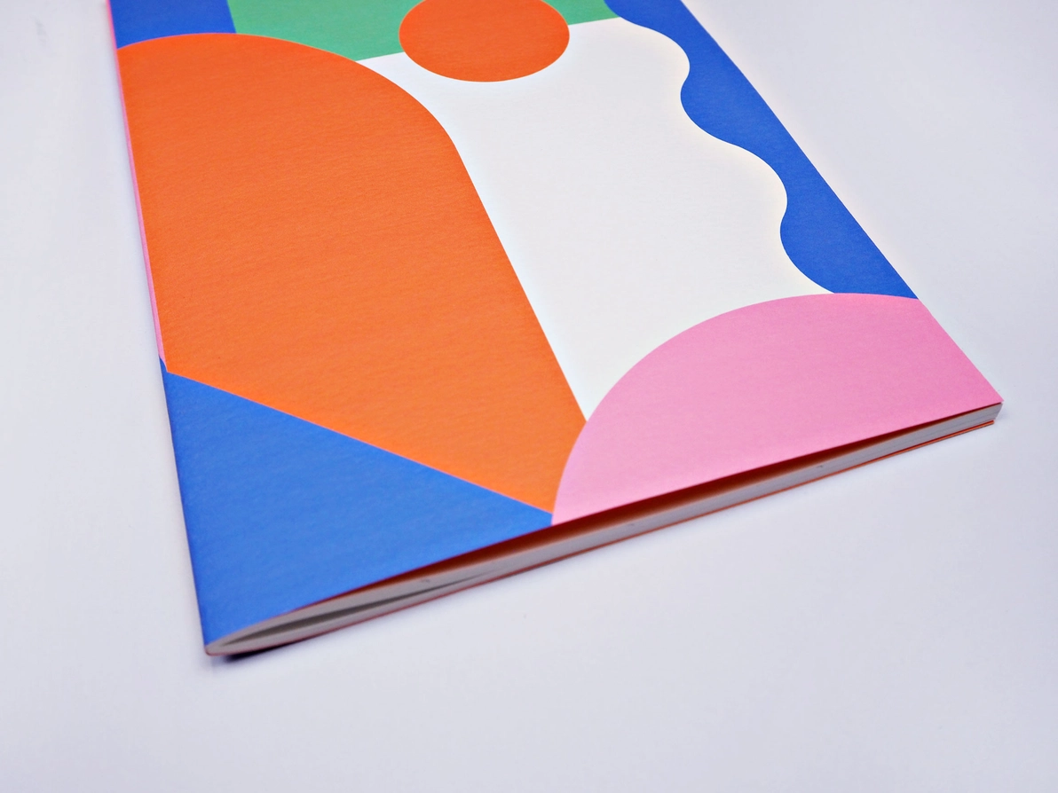 • Caderno com capa cartonada colorida com padrões geométricos abstratos.