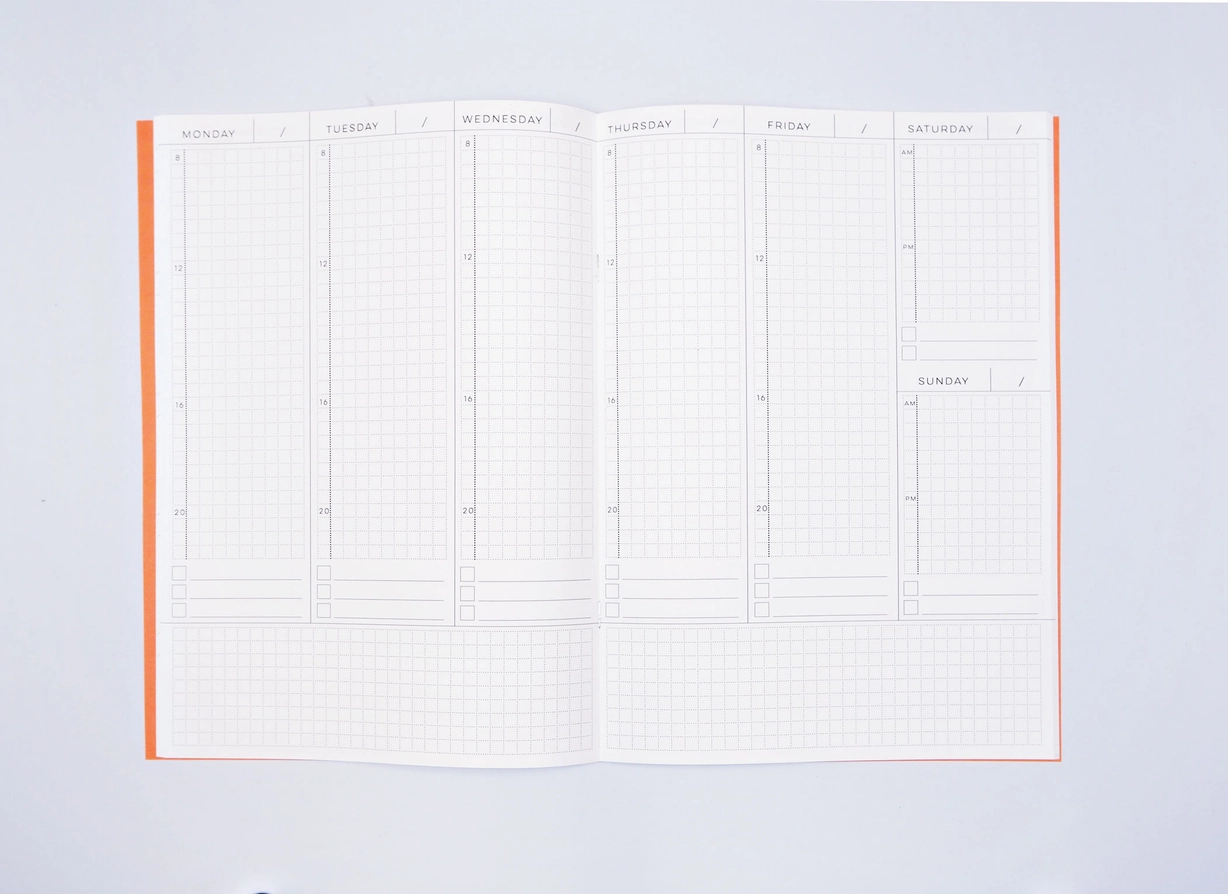 • Agenda semanal aberta com colunas para os dias da semana e capa laranja