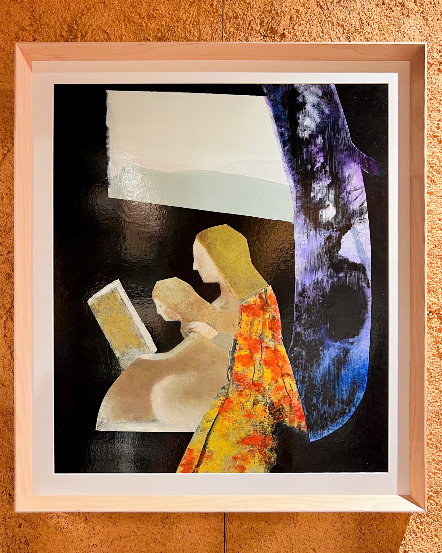 • Quadro abstrato com duas figuras femininas, moldura branca, fundo preto e detalhes azul, pendurado em parede castanha