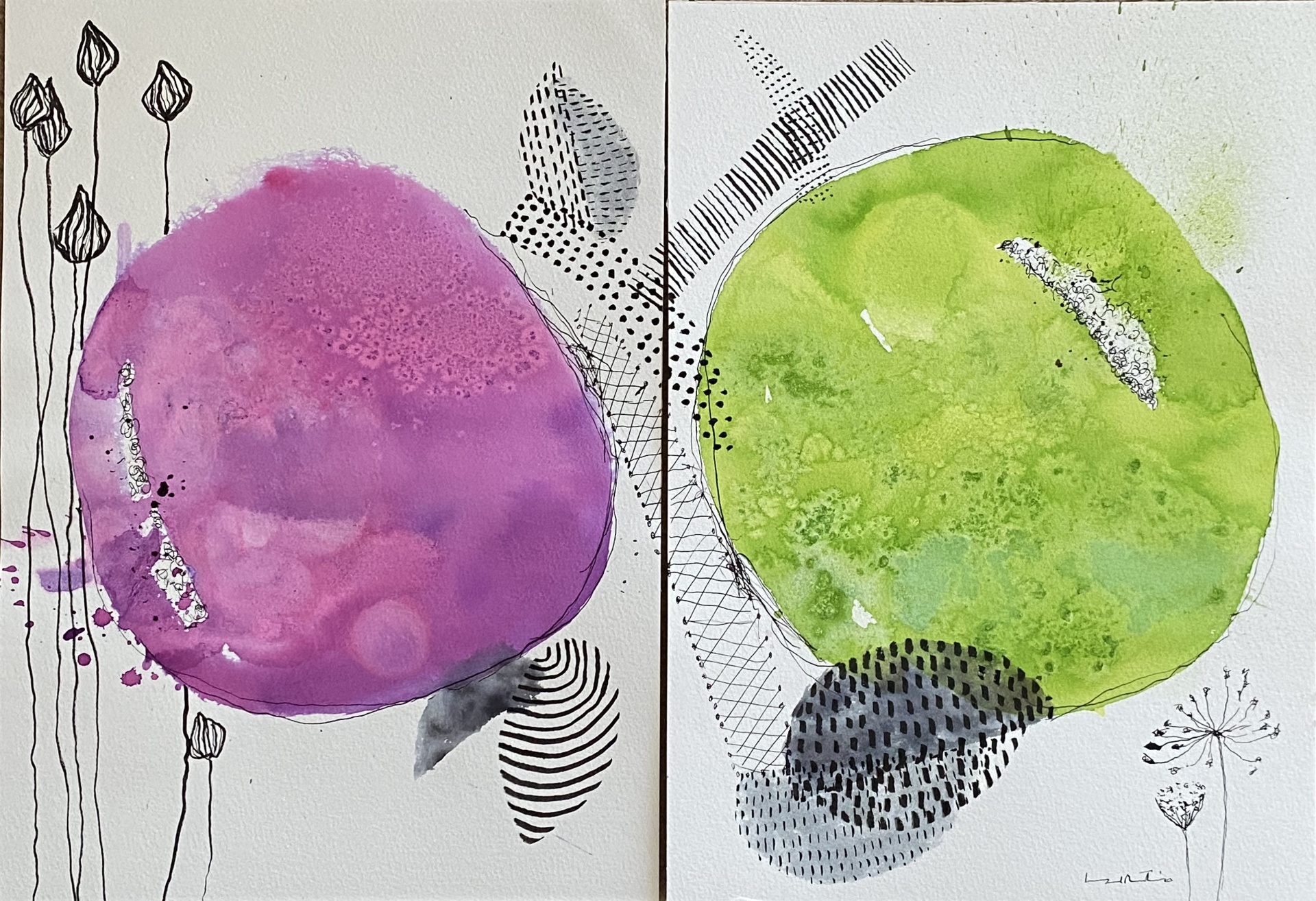 • Dois quadros artísticos com círculos coloridos, rosa e verde, com elementos florais pretos e brancos estilizados em fundo branco.