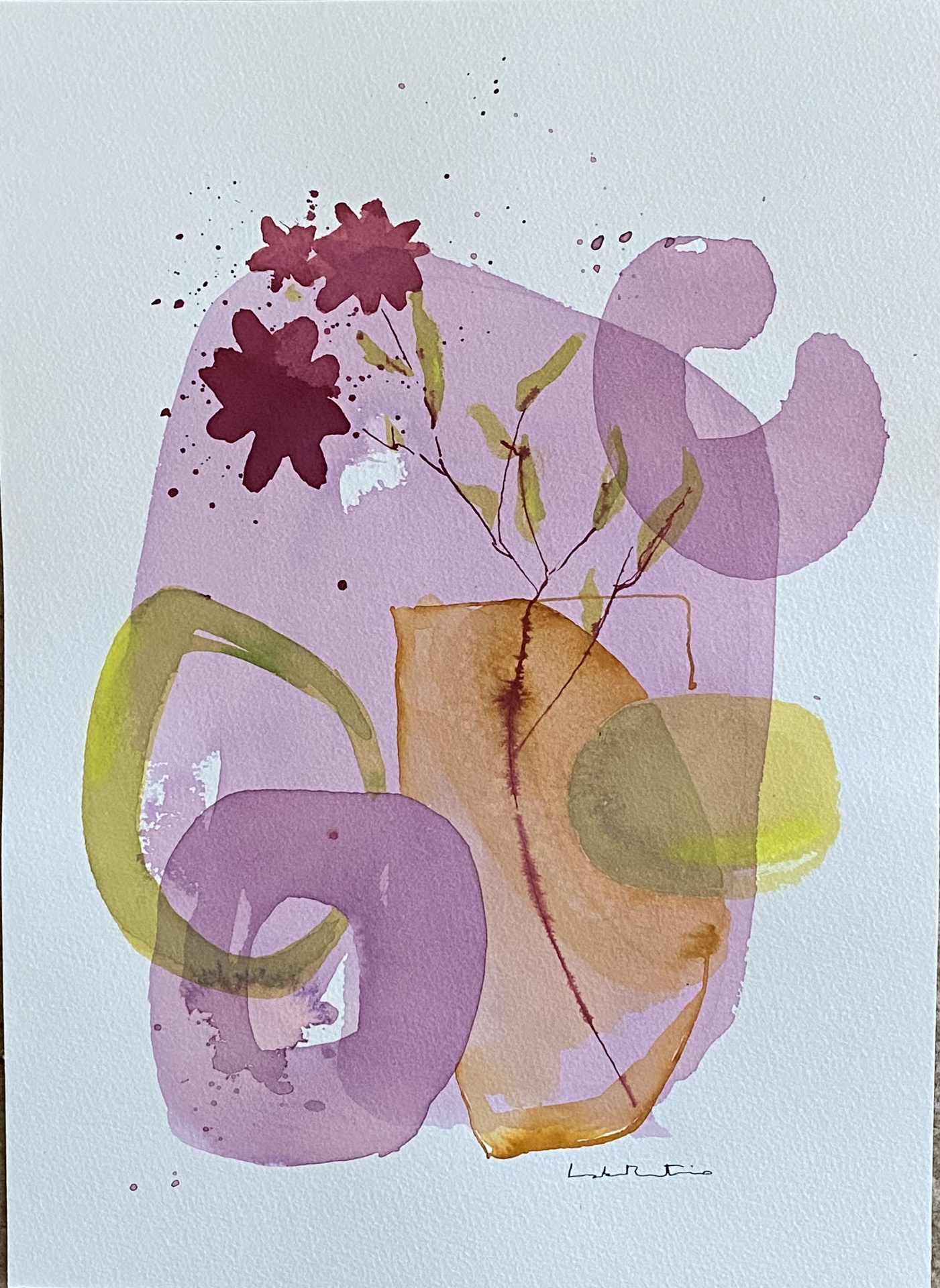 • Pintura abstrata em aquarela com formas em roxo, verde, amarelo e laranja e flores.