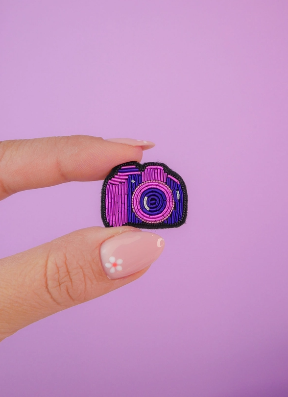 • Pin bordado em forma de câmara fotográfica roxa e rosa