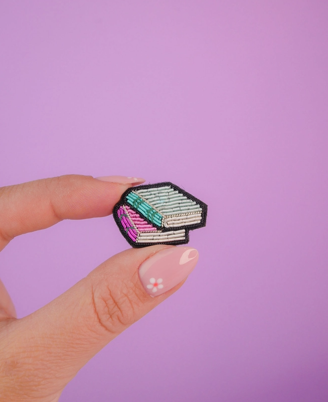 Broche de livros bordados segurado entre dedos com unha decorada em fundo roxo