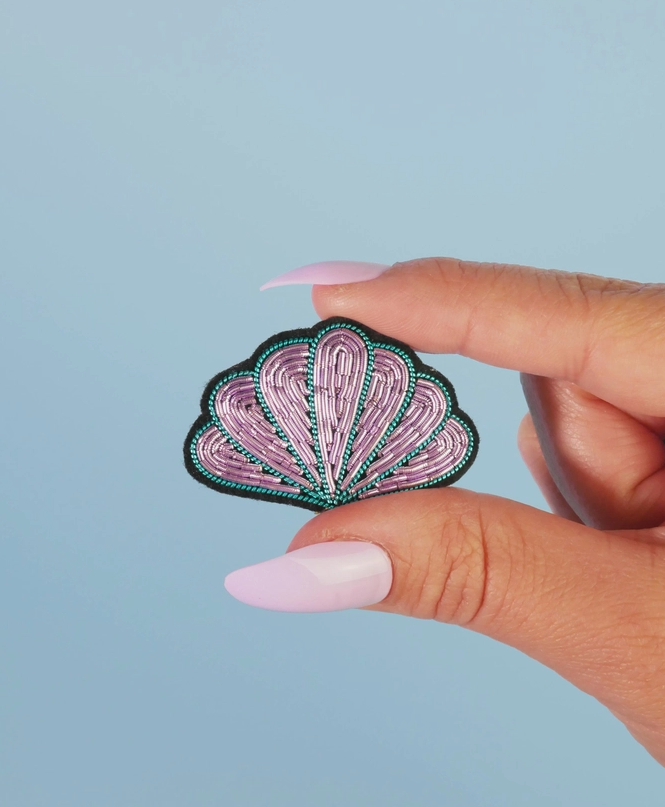 Patch bordado em forma de concha cor de rosa e verde, segurado por dedos com unhas compridas cor de rosa.