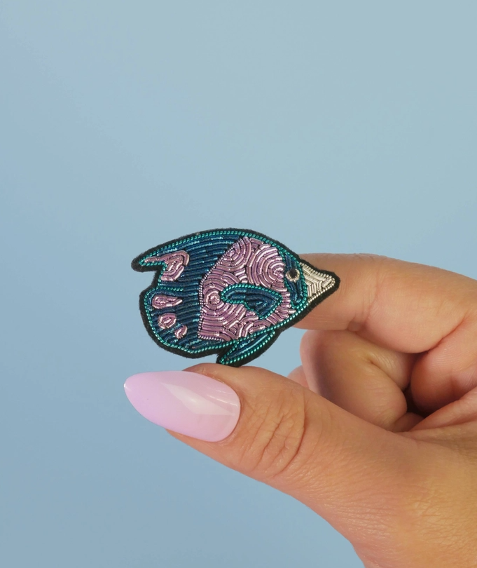 • Broche peixe azul e rosa segurado por mão com unhas cor-de-rosa