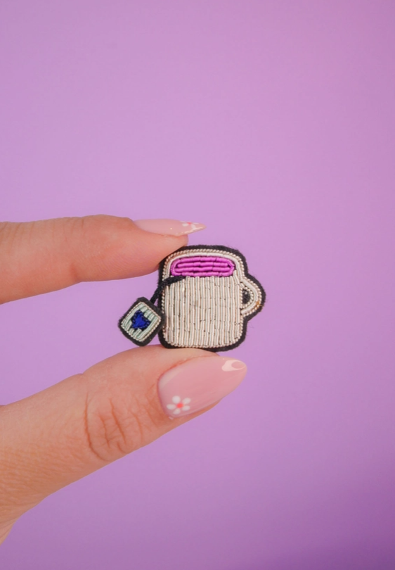Pin bordado em forma de caneca de chá com saqueta, segurado por dedos com unhas decoradas e fundo lilás