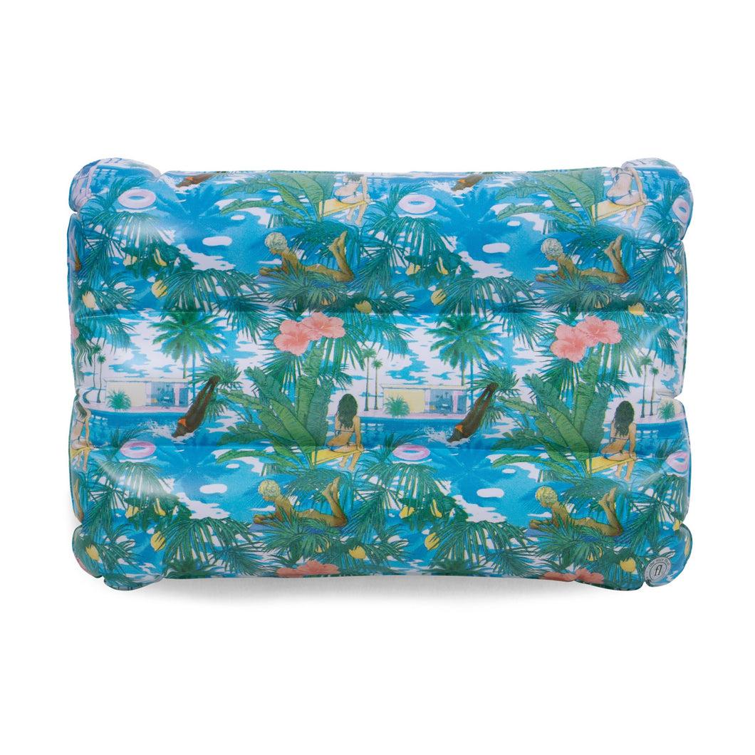 • Colchão insuflável azul com padrão tropical e figuras femininas
