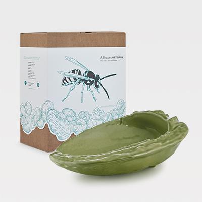 “A Bruxa e os Frutos” é uma representação própria de uma amêndoa, onde se potencializa e valoriza mutuamente a modelação digital e manual. Esta peça é fabricada em grês, vidrada num tom de verde, segundo o uso da tradição da técnica manual do mergulho. As peças são feitas à mão, podendo apresentar pequenas variações. A peça permite a lavagem à máquina e o uso do micro-ondas.