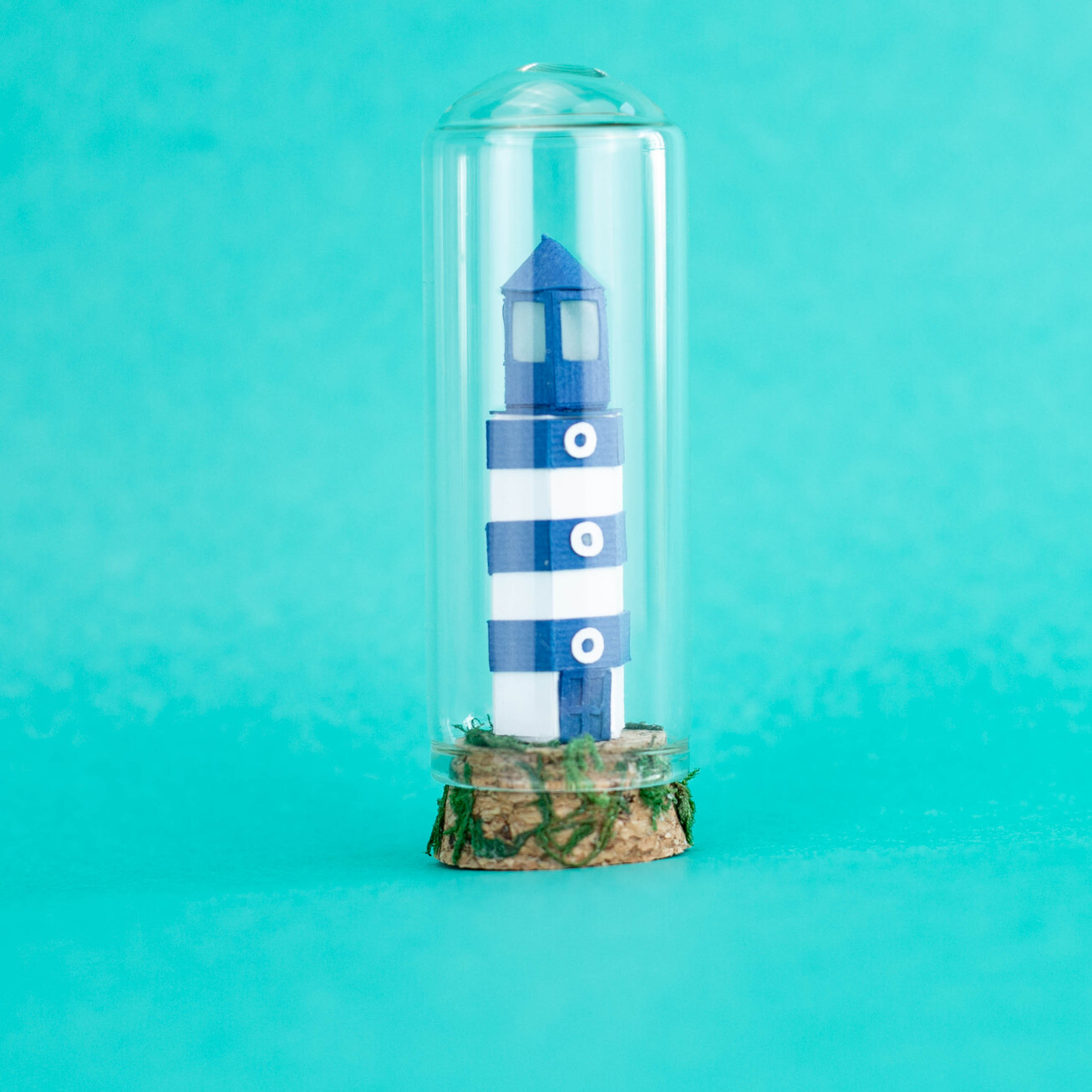 Miniatura de farol azul e branco em base de cortiça e vidro transparente