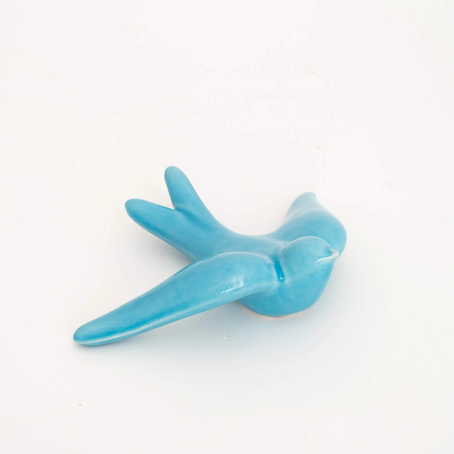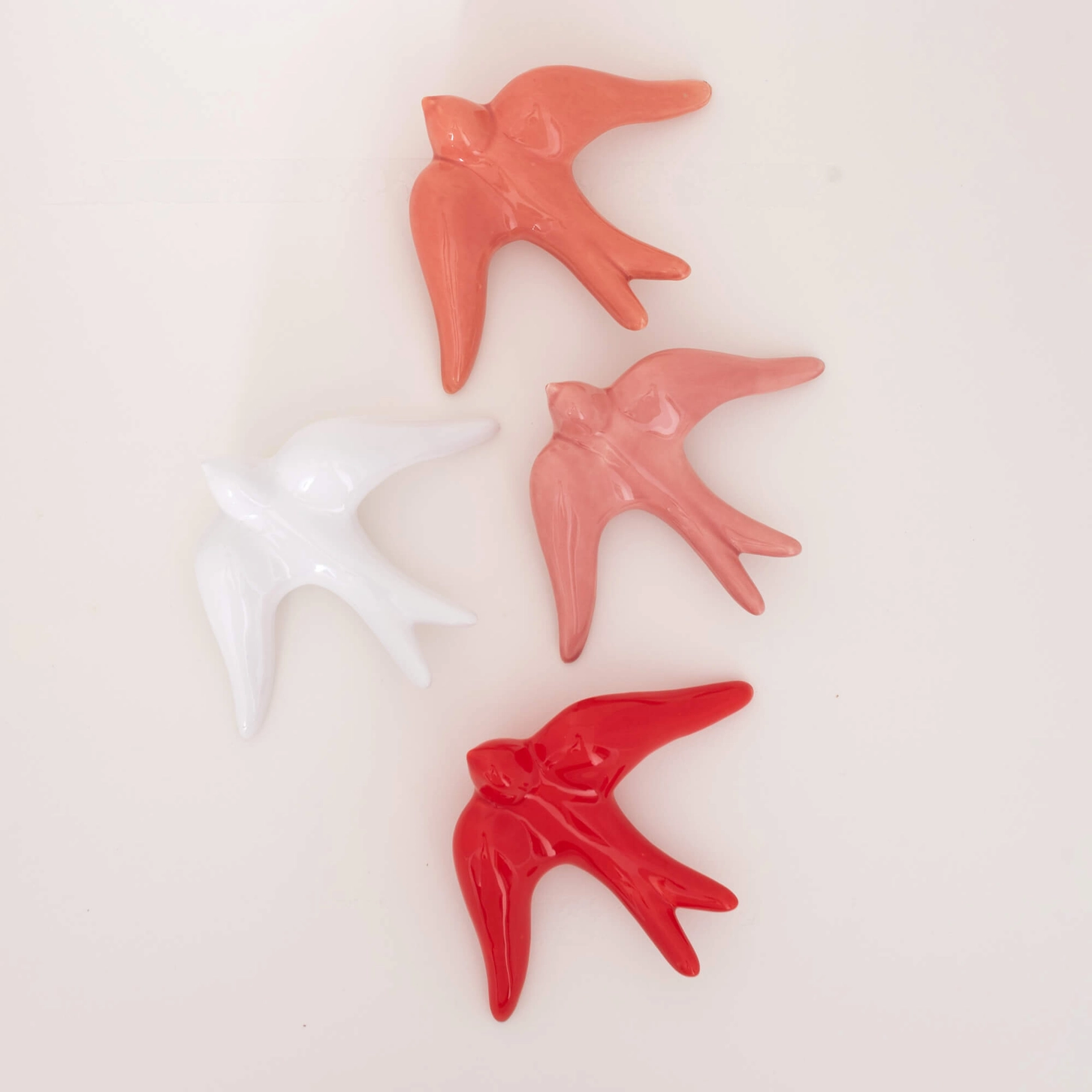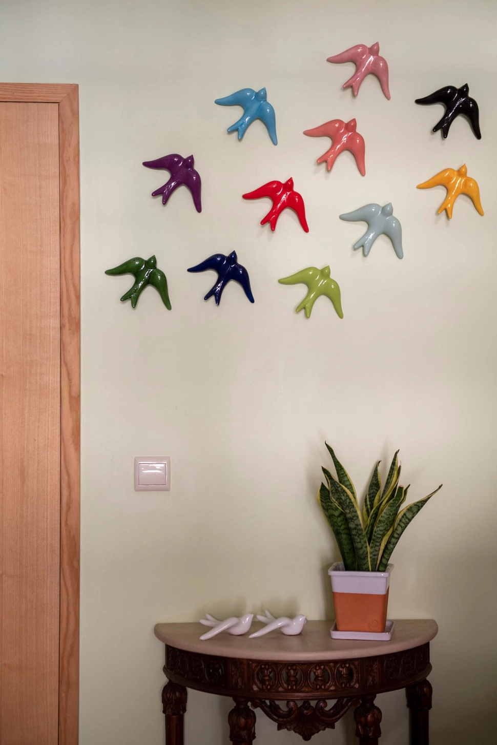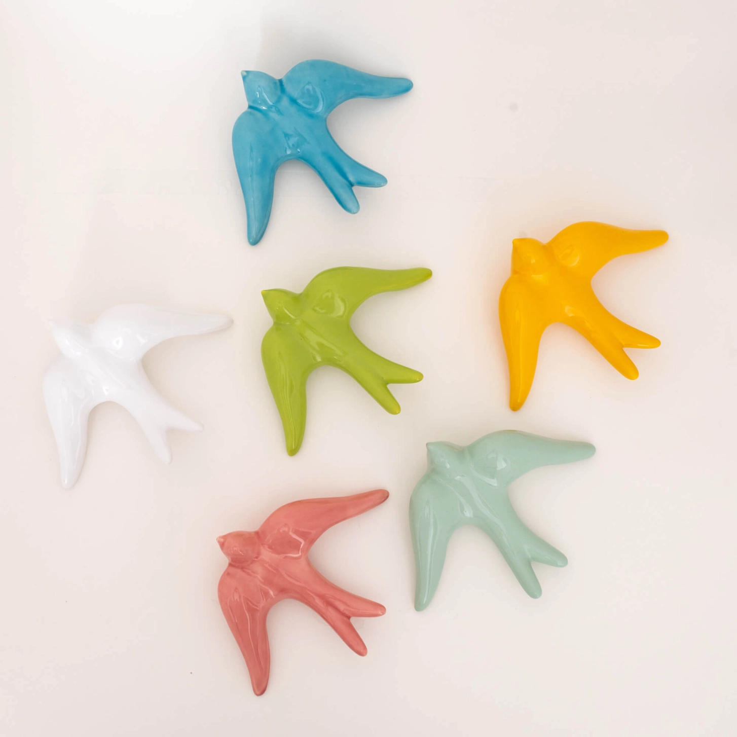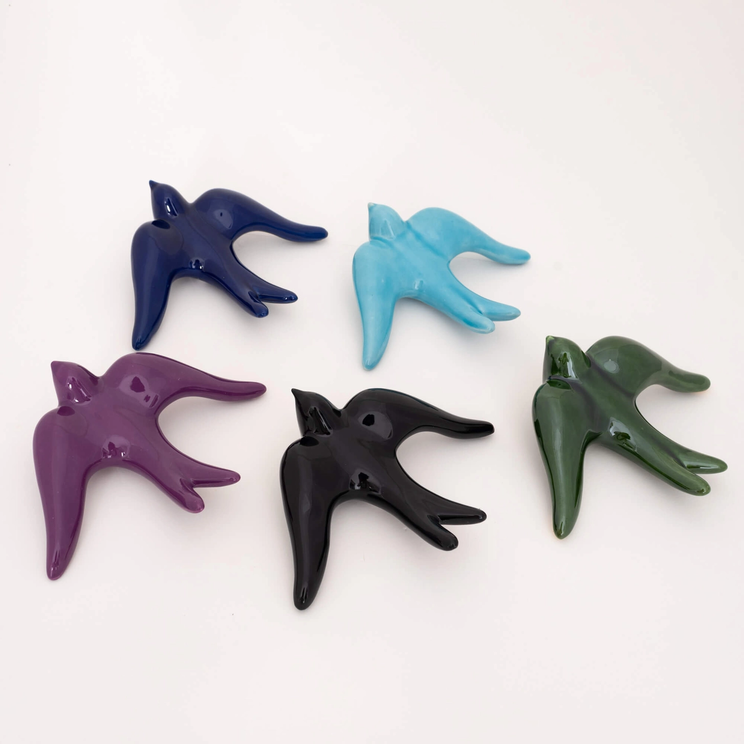 Especificações: Andorinhas em faiança vidradas em várias cores com um orifício para pendurar na parede. Comprimento de asa a asa: 13.5 (cm) | Largura: 18 (cm) | Peso: 200 (g)