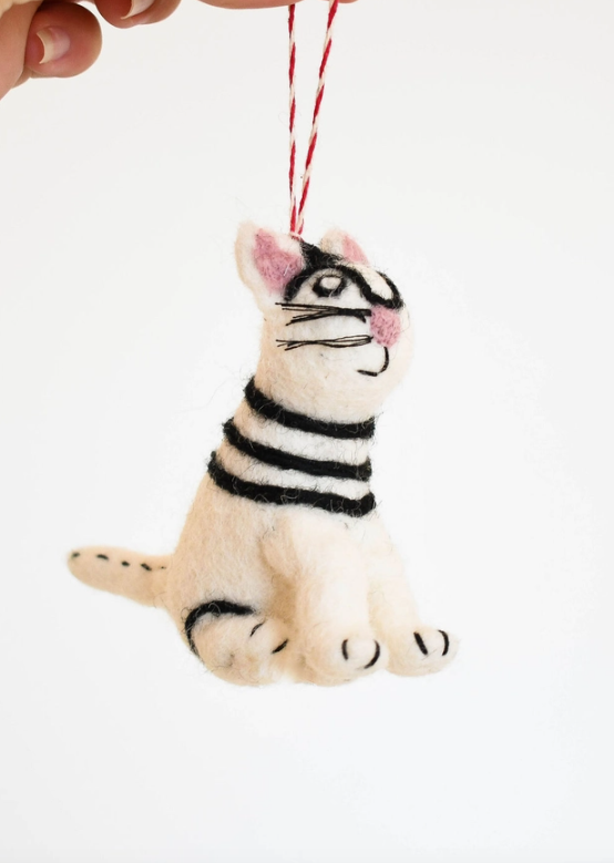FELINE FELT, FUR FRIENDS Introducing 'Pablo Picatso' inspired by art legend Pablo Picasso. These feline felt tree decorations make the ideal gift or PURR-fect for hanging on the Christmas Tree. - Original design by Nia Gould - Felted wool decoration - 100% fair trade - Handcrafted in Nepal - Due to the hand crafted nature and naturally dyed felt wool the products may vary slightly from the image shown.