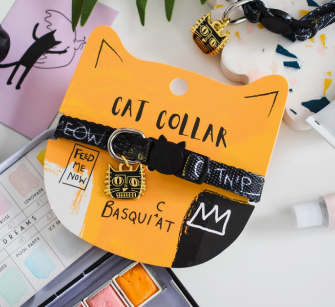 BasquiCAT The ‘Cat Artist' pet accessories range is a feline reimagining of some of the greatest artists of all time, just for your art loving cat. A unique and colourful cat collar that will make your cat stand out from the rest, with matching cat shaped enamel charm. The 'BASQUICAT' collar is a feline interpretation of street art legend, Jean-Michel Basquiat now reimagined as 'BasquiCAT.’ Combining a love of cats and a passion for art, illustrator and designer Nia Gould (‘Niaski’) has created a punny pet accessories range celebrating the life and times of artistic felines. Cats are not always the biggest fan of collars so these are soft yet strong and fitted with a safety breakaway clasp that will break free should your cat get caught on anything whilst out and about. Fully Adjustable Fitted with a safety breakaway clip Matching 20mm enamel charm Longest length 260mm Smallest length 160mm