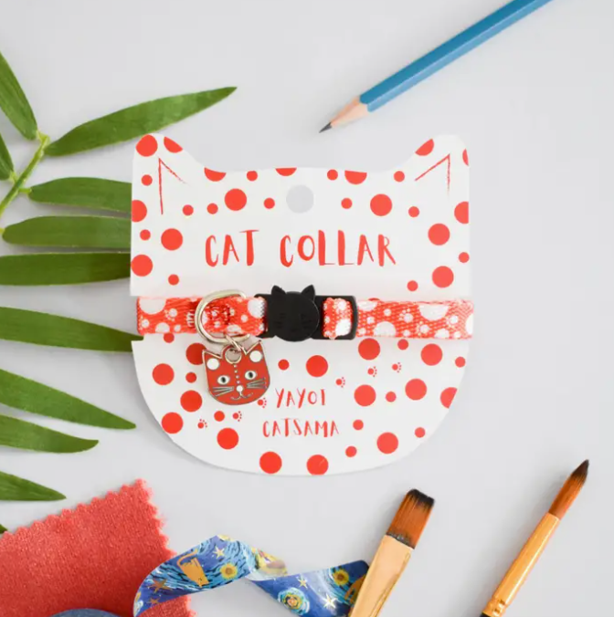 YAYOI CATSAMA The ‘Cat Artist' pet accessories range is a feline reimagining of some of the greatest artists of all time, just for your art loving cat. A unique and colourful cat collar that will make your cat stand out from the rest, with matching cat shaped enamel charm. The 'Catsama'' collar is a feline interpretation of dotty Pop Art legend, Yayoi Kusama now reimagined as 'Yayoi Catsama.’ Combining a love of cats and a passion for art, illustrator and designer Nia Gould (‘Niaski’) has created a punny pet accessories range celebrating the life and times of artistic felines. Cats are not always the biggest fan of collars so these are soft yet strong and fitted with a safety breakaway clasp that will break free should your cat get caught on anything whilst out and about. Fully Adjustable Fitted with a safety breakaway clip Matching 20mm enamel charm Longest length 260mm Smallest length 160mm