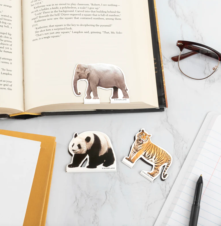 • Marcadores de livros em forma de elefante, panda e tigre sobre mesa com livro, óculos e cadernos