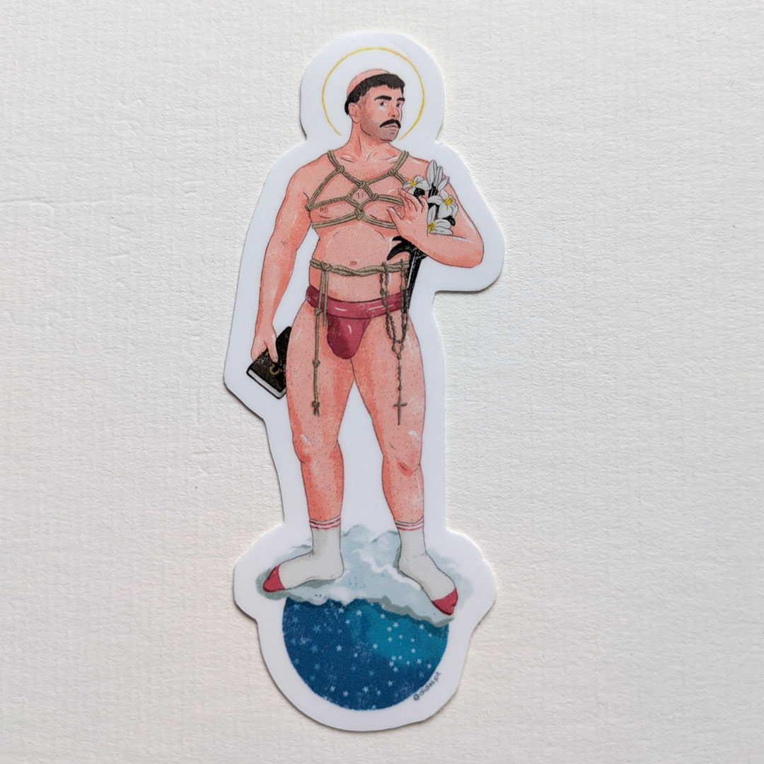 • Adesivo de homem com arnês e cueca em esfera azul estrelada