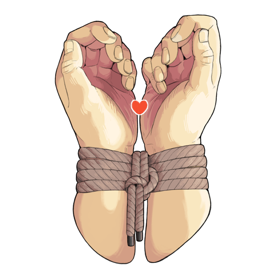 Mãos femininas amarradas com corda e um coração vermelho entre os polegares