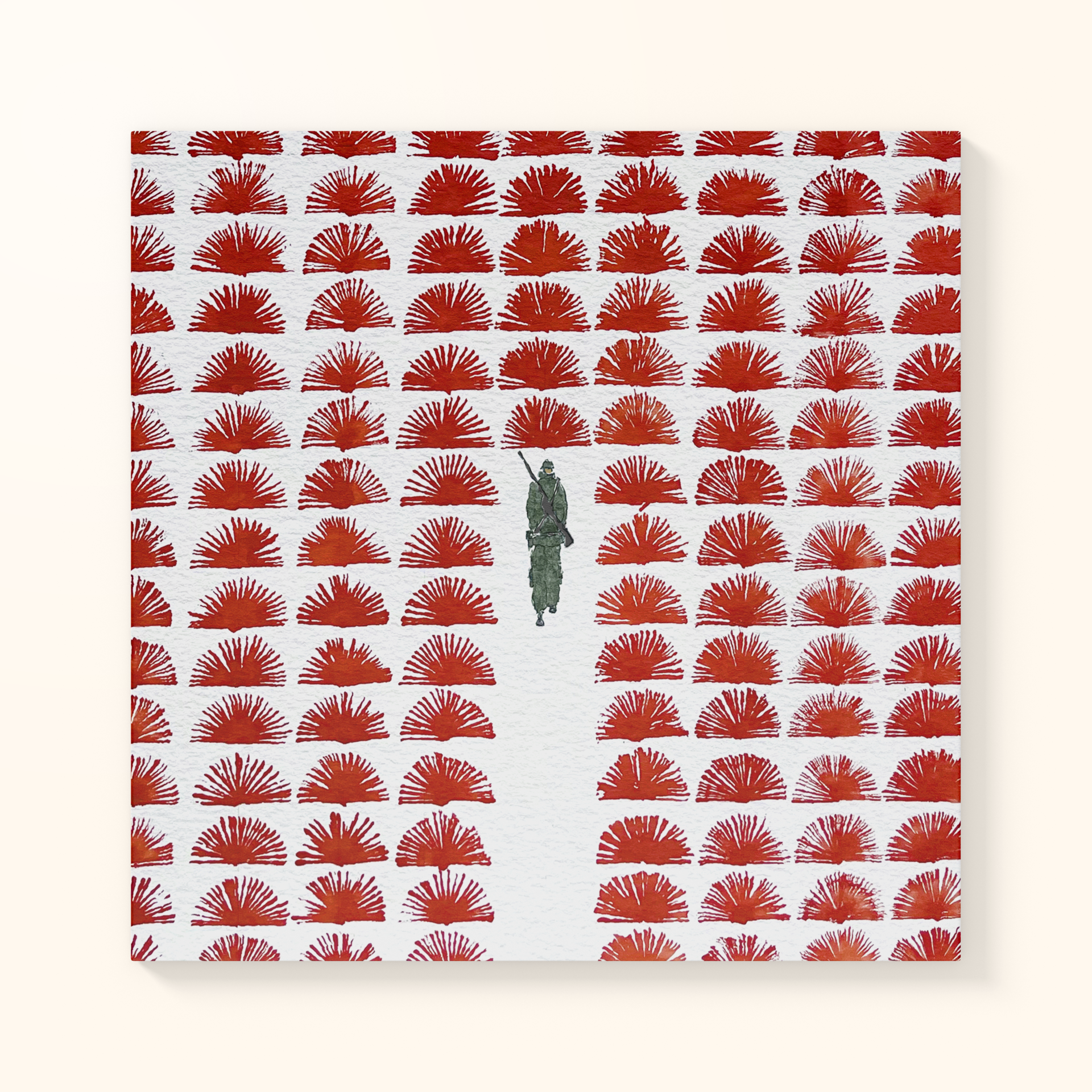 Tela com padrão vermelho e figura de soldado verde no centro