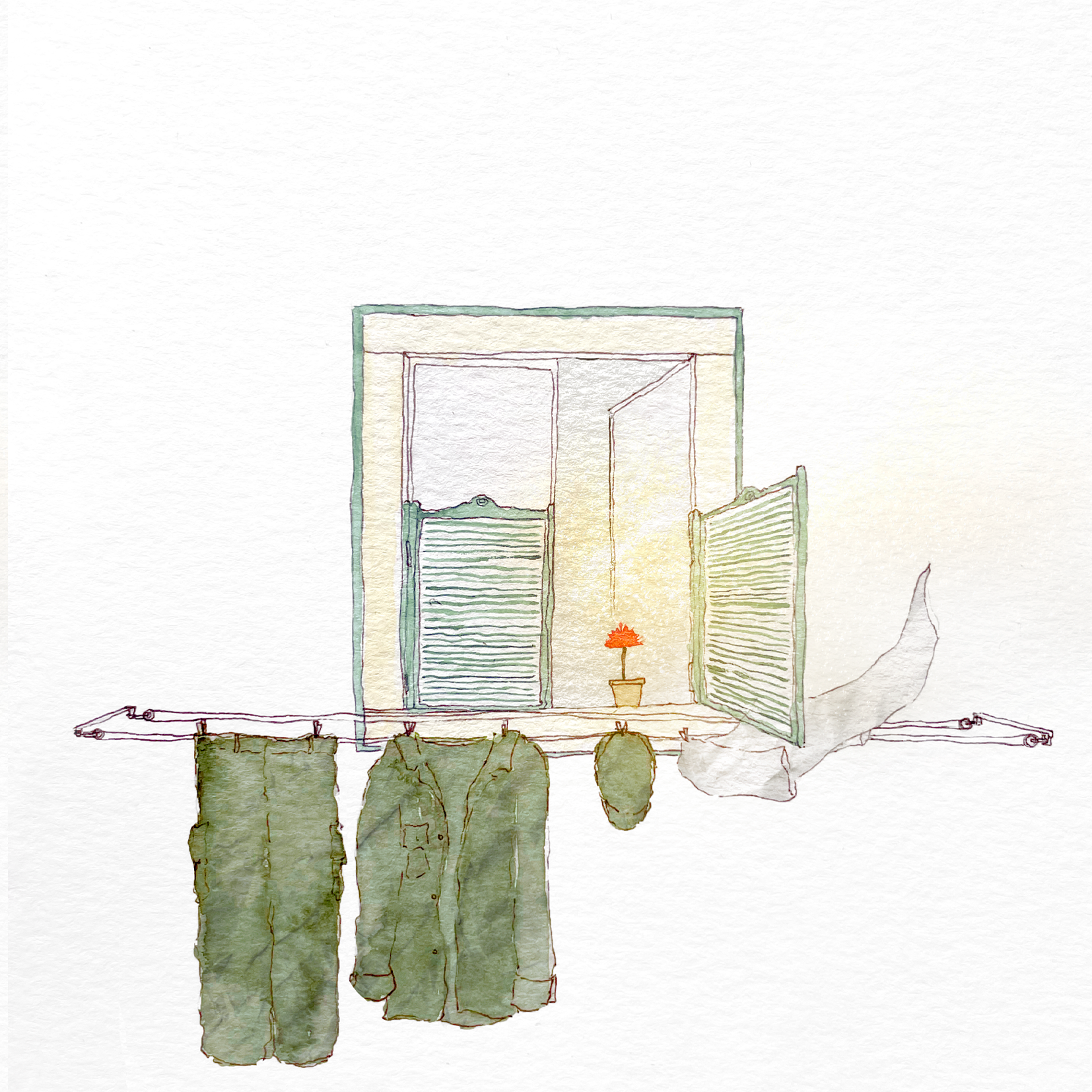 • Janela verde com estendal com roupas verdes penduradas e vaso com flor laranja dentro