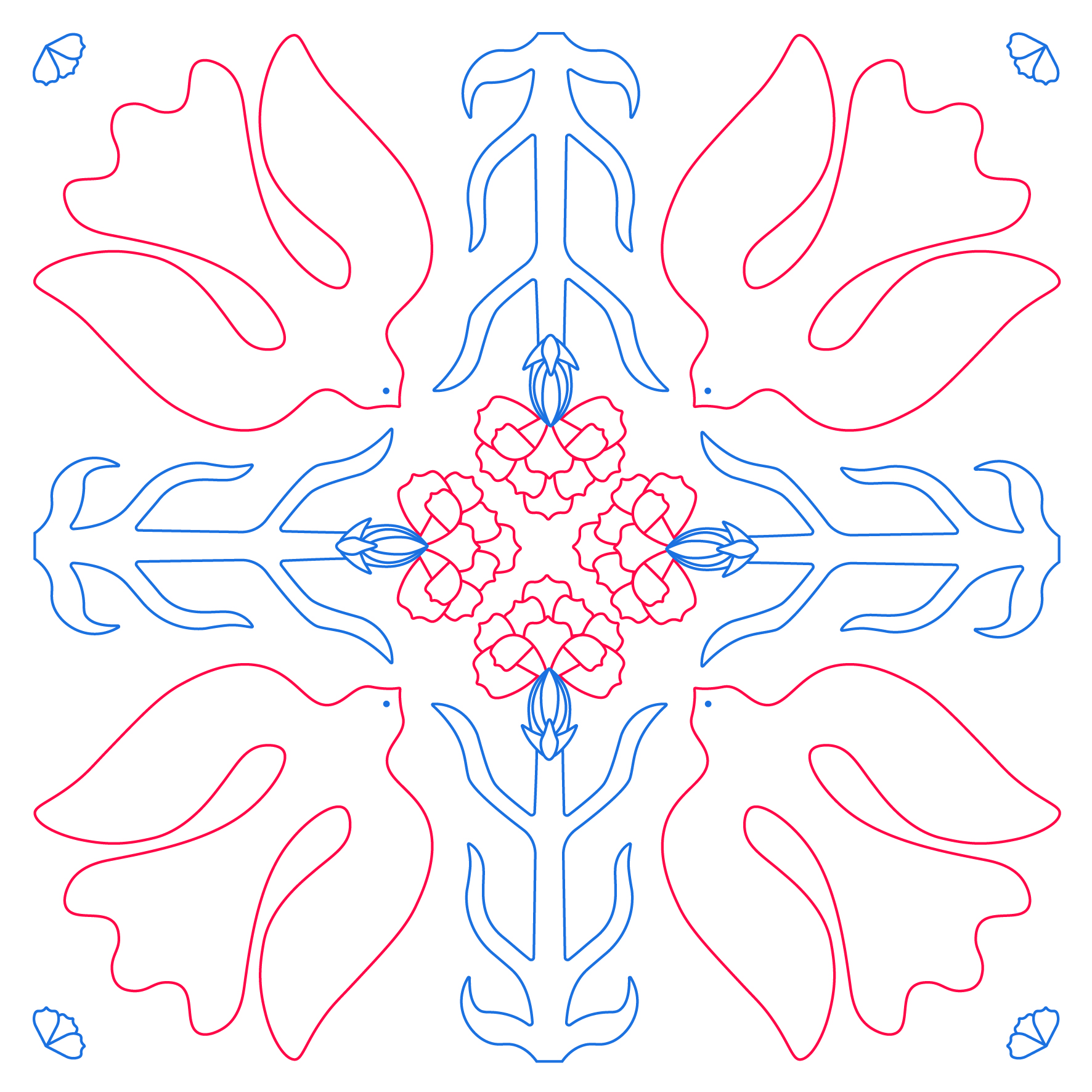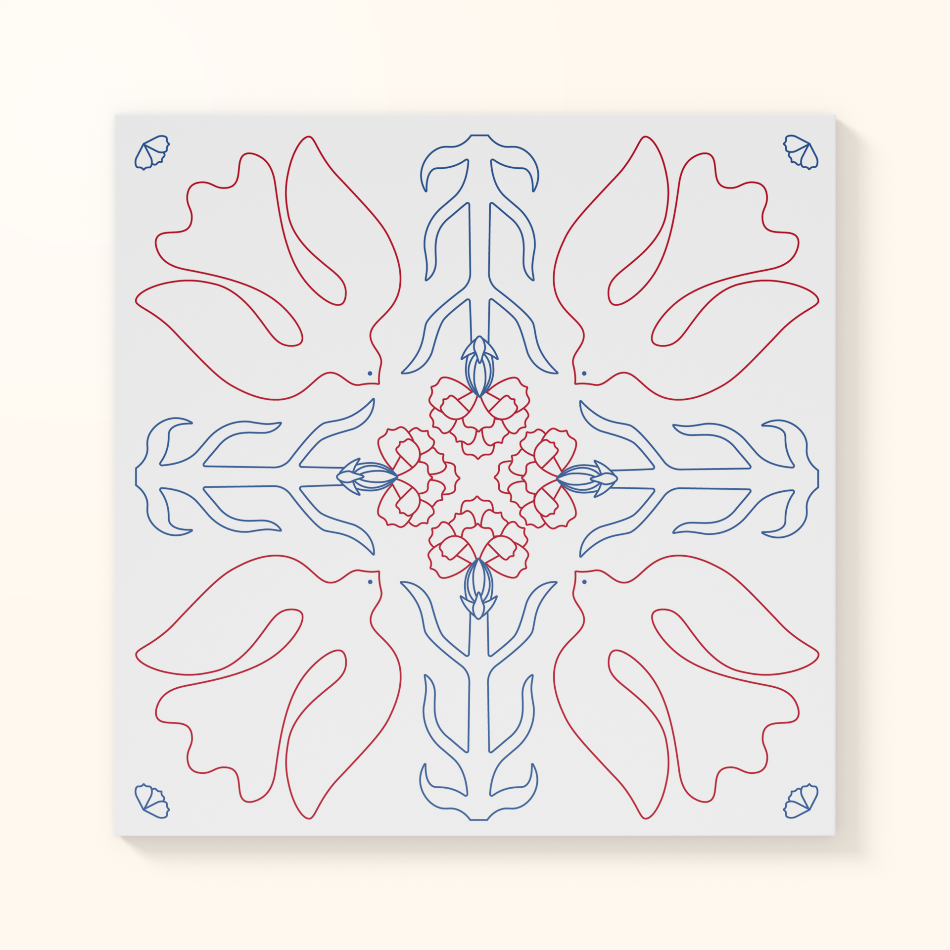 Cravos vermelhos e pombas brancas, símbolos de liberdade e de paz, num registo gráfico que remete aos antigos azulejos portugueses, com a flora e fauna como elementos decorativos. Duas cores, vermelho dos cravos e da revolução e azul da paz e da harmonia.