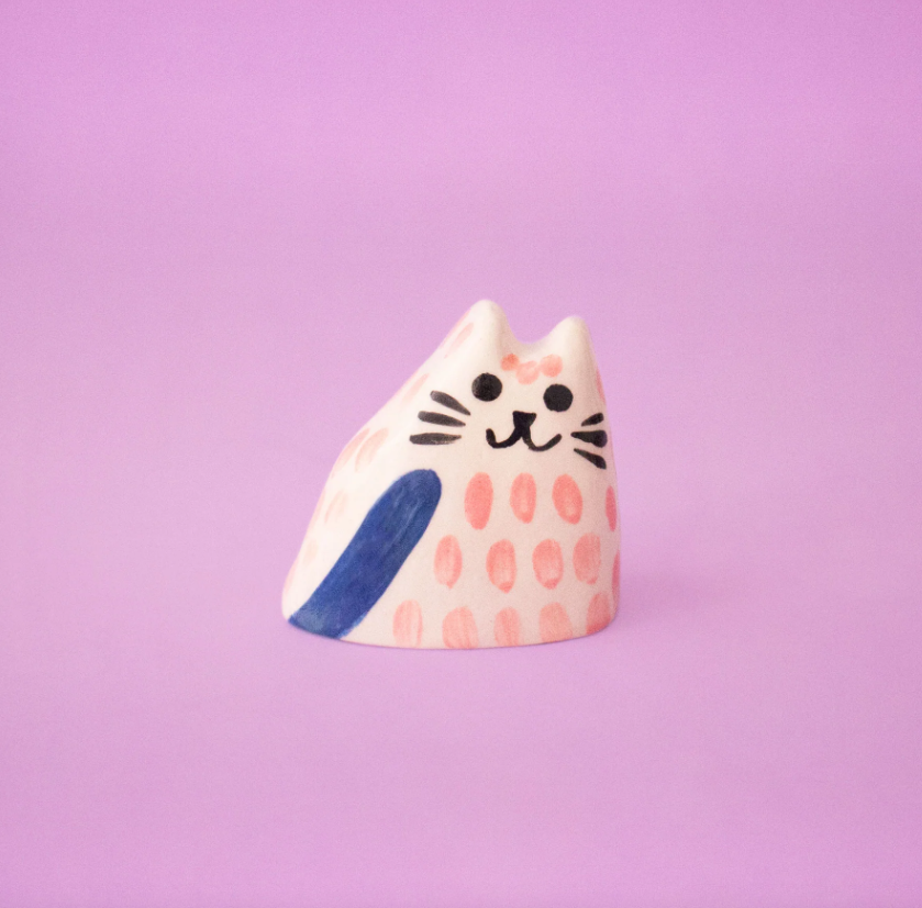 • Escultura cerâmica de gato pintado à mão com padrão rosa e azul