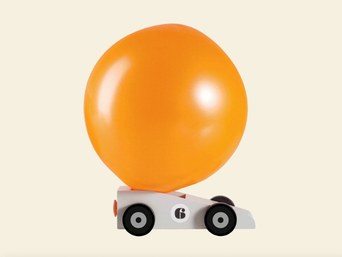• Carrinho de brinquedo branco com balão laranja