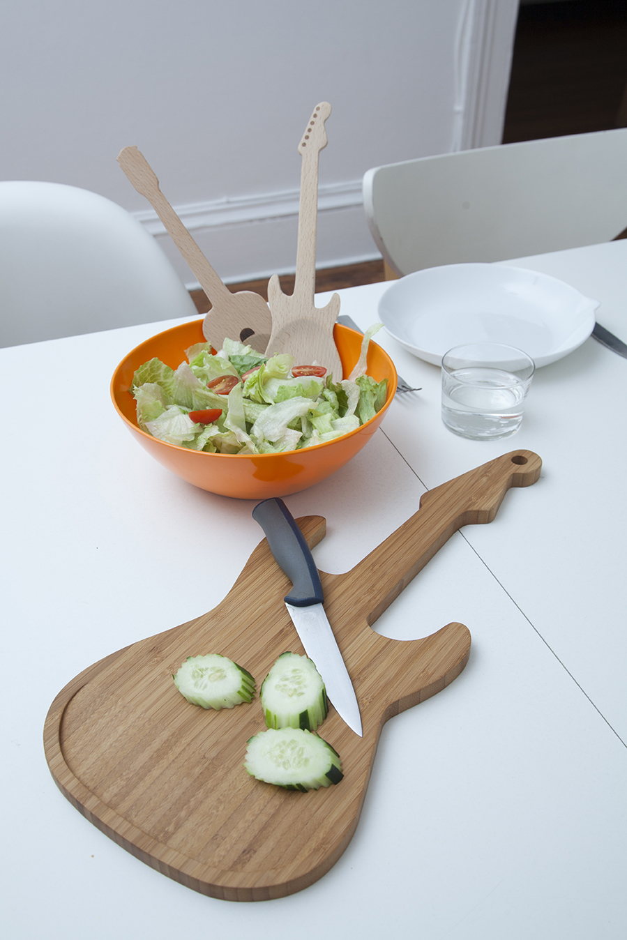 • Tabuleiro em forma de guitarra com fatias de pepino e faca, tigela laranja com salada e marcadores de salada em forma de guitarra