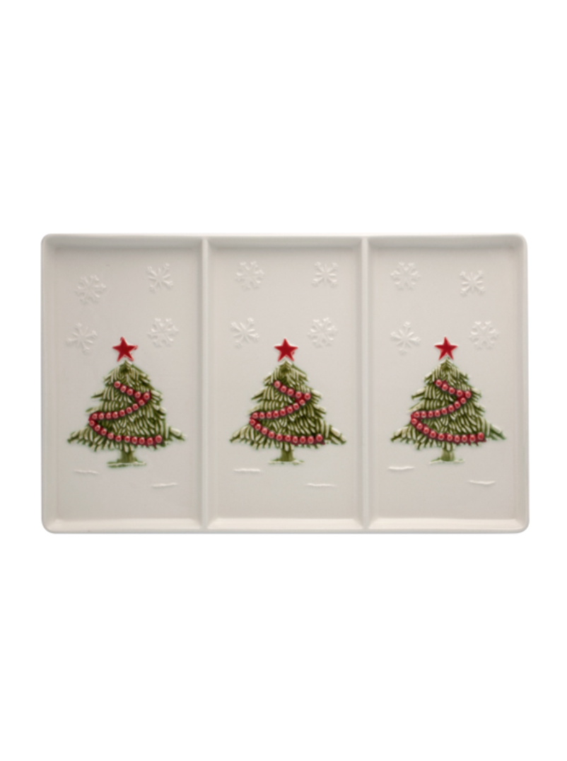 • Tabuleiro de cerâmica branca com três árvores de Natal verdes decoradas e flocos de neve em relevo
