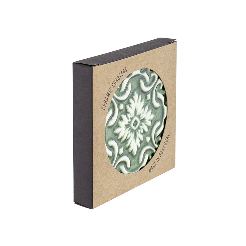 • Base de copos em cerâmica com padrão verde e branco na embalagem de cartão