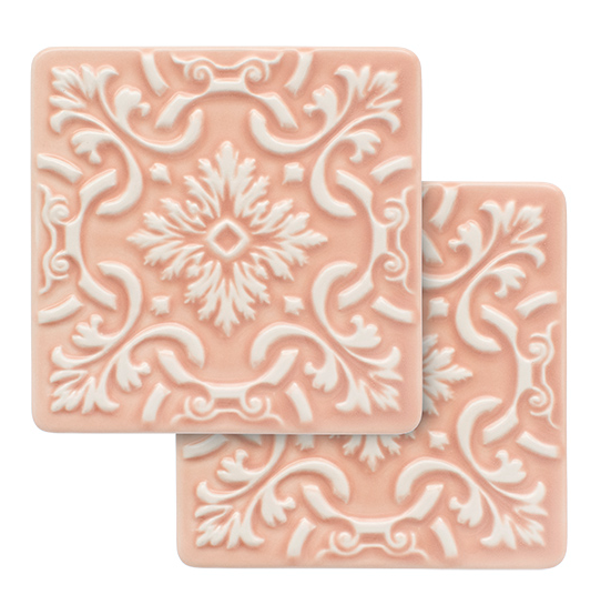 • Telhas decorativas quadradas cor salmão com detalhes brancos e padrão em relevo