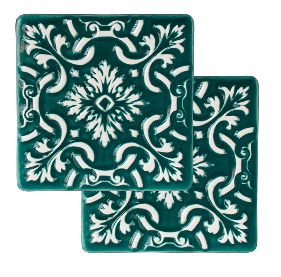 • Dois azulejos quadrados de cerâmica verde com padrão branco ornamental