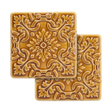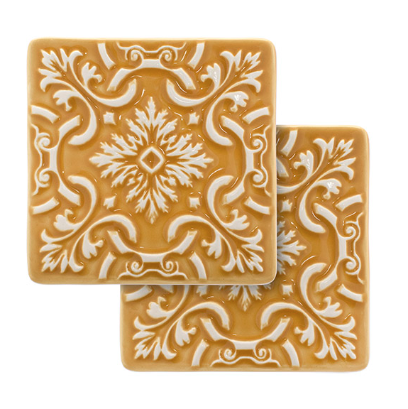 • Dois azulejos quadrados amarelo dourado com padrão branco decorativo em relevo.