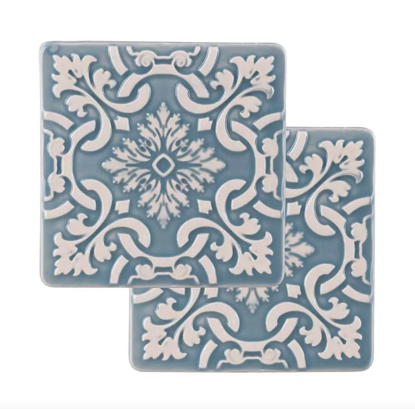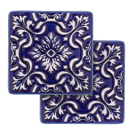 Bases de copos em cerâmica decorada à mão com motivo de azulejo português em alto relevo.