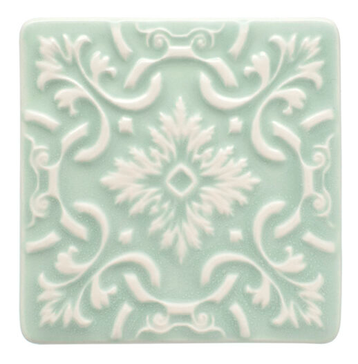 • Azulejo cerâmico verde água com padrão floral em relevo.