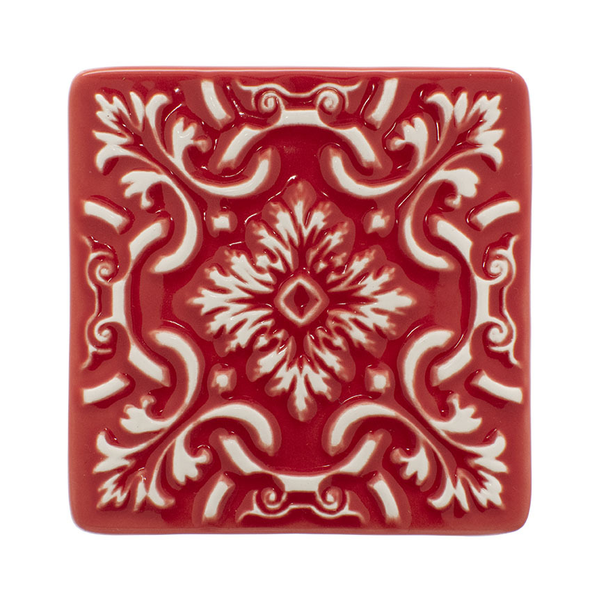 • Azulejo decorativo quadrado vermelho com padrão floral branco em relevo